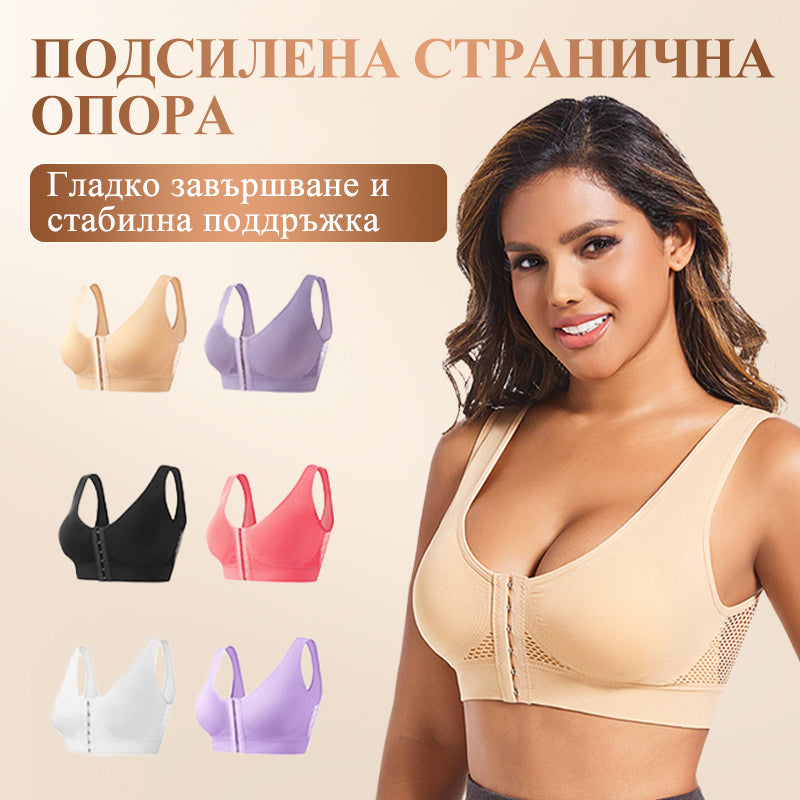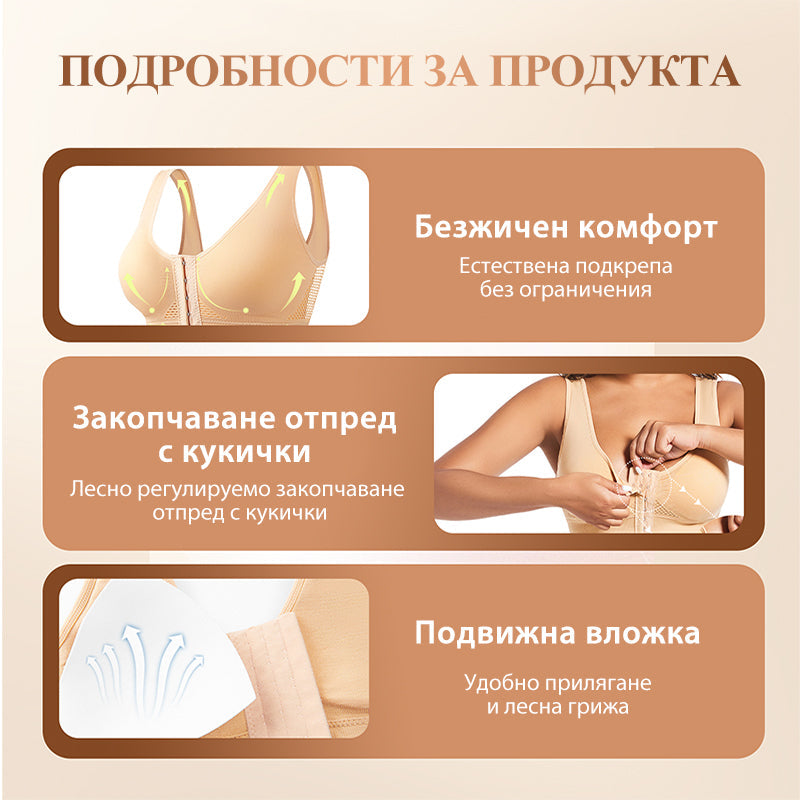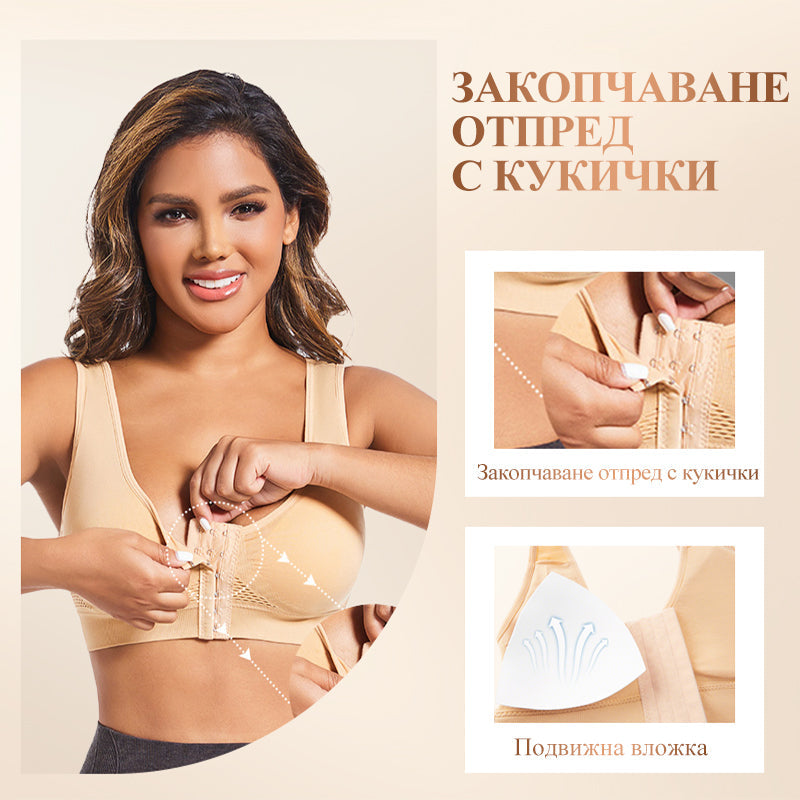 ЛЕСНО ЗАКОПЧАВАНЕ ОТПРЕД: Облечете сутиена за секунди благодарение на умната система за закопчаване отпред. Три реда кукички позволяват регулиране на обиколката според нуждите през деня, а слагането и свалянето е просто – без досадно закопчаване на гърба.