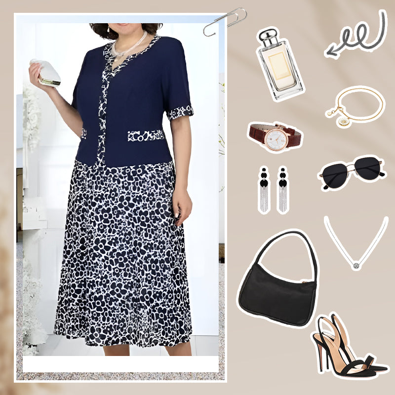 Подобно на костюм от две части, тази елегантна рокля съчетава флорална рокля с прилепнала горна част в стил жилетка за комфорт и красота.